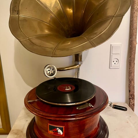 Et smukt pladespiller, lavet i Schweiz. Spiller højt og klart. Restaureret, i museumskvalitet. Fantastisk musikinstrument, og meget højt med en subtil bas. Dette er skabt af det store kabinet. Et smukt møbel til nobel dekoration.