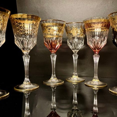 Sæt af seks glas i Murano-glas, håndlavede som en hyldest til de pragtfulde glas fra de venetianske doger.