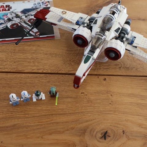 Tre fantastiske LEGO STAR WARS-sæt: 8017 Darth Vaders TIE Fighter; 7672 Rogue Shadow; 8088 ARC-170 Starfighter.