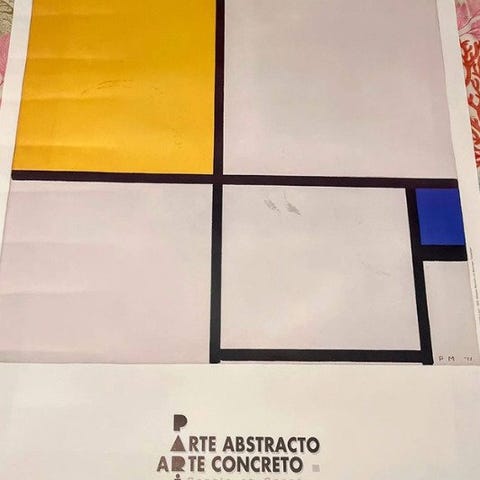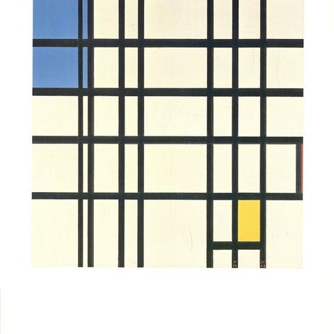 - Piet Mondrian (efter), autoriseret offsettryk på tykt, glat satintrykpapir (ca. 300 g/m²).