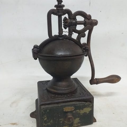 Her tilbydes en klassisk, mekanisk håndmølle til kaffe ('skuffemølle') lavet af træ.