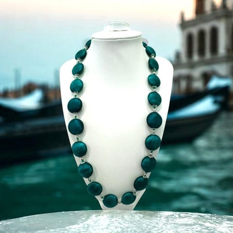Murano-glas halskæde i dynastisk stil 2000, 21 hjerteformede perler, 45 cm lang og 70 g tung, blåligt glas fusioneret i gult guldbindende 24 kt guldblad, fremstillet i Murano; leveres med gaveæske og produktionscertifikat. Klik på den blå "gå til varen" knap, for at købe eller byde på denne vare. Den samlede pris vil blive vist inden du afgiver dit bud.