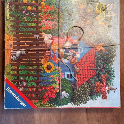 Ravensburger 1000 brikker puslespil med motiv af et hus ved en sø omgivet af blomstrende træer og planter.