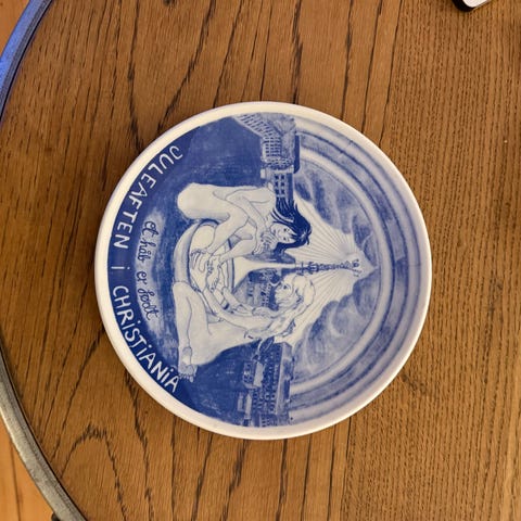 Juleaften i Christiania Juleplatte fra 1979 med blå-hvidt motiv. Porcelæn med juletema, der forestiller to personer ved en skål foran et bylandskab. Platten har ophæng bagpå til vægophængning og er dekoreret med tekst og symboler relateret til Christiania og julen.