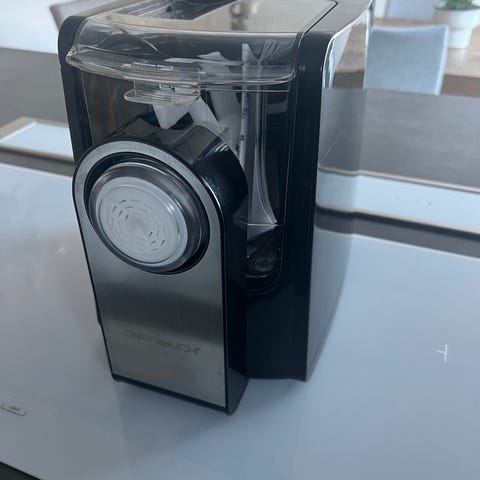 Maskinen er hvid og har forskellige forme til ovennævnte pastatyper. Den har timer-, og automatfunktion med mere. Opskriftshæfte og brugsvejledning medfølger. Kun brugt få gange.