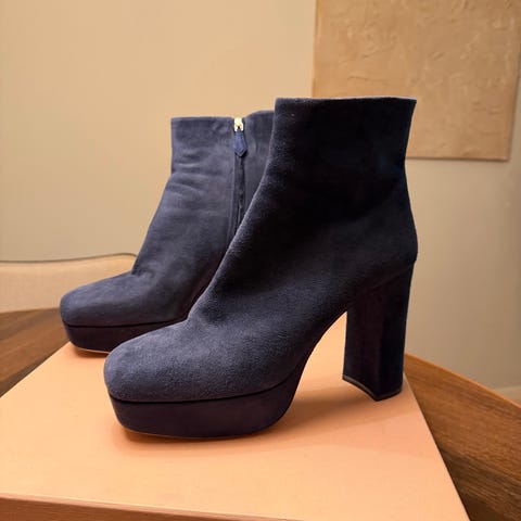 Olivengrøn med sort snude. Hælen er 10 cm høj. De er forsålet og i meget god stand. Bemærk, der er to smả 'mærker' i lakken pả den ene sko, man bemærker det kun, hvis man ved det, se billede. Skoene er i øvrigt forsålet hos skomageren.