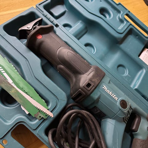 Makita DJR186 bajonetsav med 18V batteri. Værktøjet er designet til alsidig brug og har en robust konstruktion. Passer til forskellige saveopgaver.