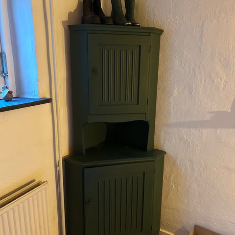 Fint hjørneskab, som vi selv har malet i den blå farve. Kan evt slibes og males i en anden farve. Sælges grundet flytning.