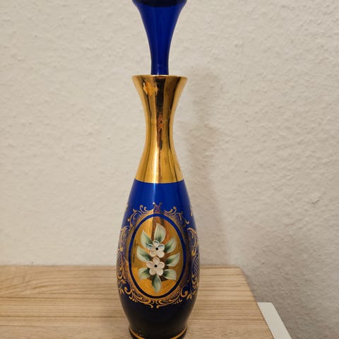 Fin vintage sø blå karaffel, med top formet som et blad.