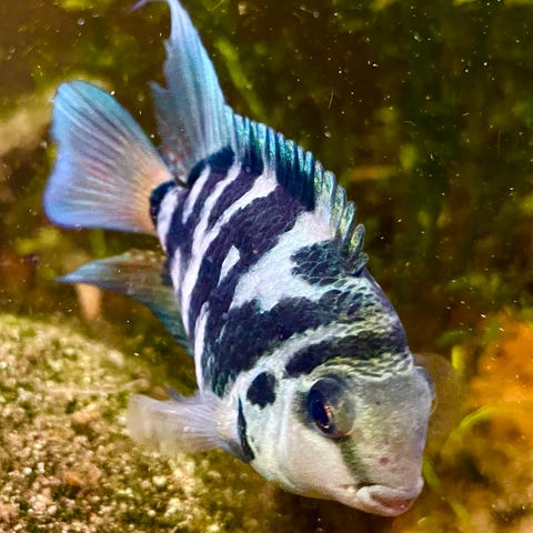 Sælger 4 meget flotte blå cichlider (akara-type) med intense blå farver og flot kropsform. Fiskene er sunde aktive og spiser fint både flage- og frostfoder.
