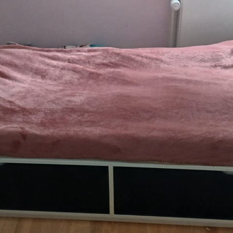 Seng med 2 skuffer som hver er inddelt i 4 rum. Der er masser af plads til fx legetøj osv.
