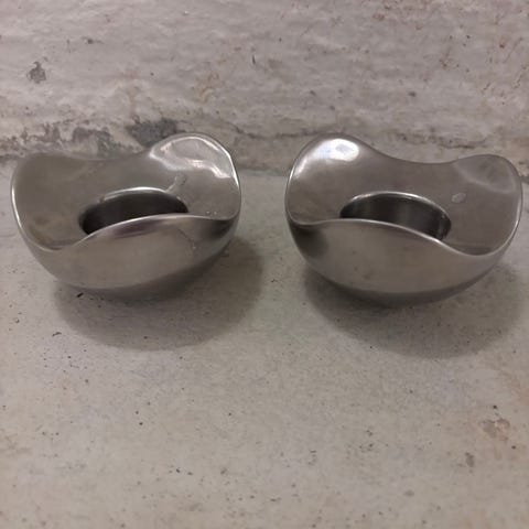 Helt nye og ubrugte Georg Jensen lysestager, 2 stk ens til alm kronelys. Klassisk design, fremstillet i blankpoleret rustfrit stål. En del af Bloom serien fra Georg Jensen, designet af Helle Damkjær. Normalpris 520 kr for denne æske med 2 stk i.