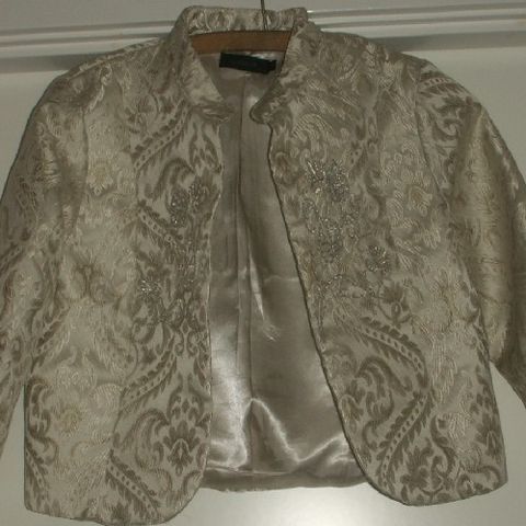 Rigtig smart lille sort overdel/Jakke med mange finesser. Kort model med forstykker der buede forneden og med 2 små pyntelommer, lynlås langs underkanten og ved ærmer som pynt, og med stor broderi på ryggen