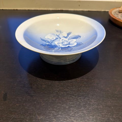 Bing & Grøndahl skål med blå blomstermotiv på hvid baggrund. Skålen er lavet af porcelæn og har en rund form. Velegnet til servering eller dekoration.
