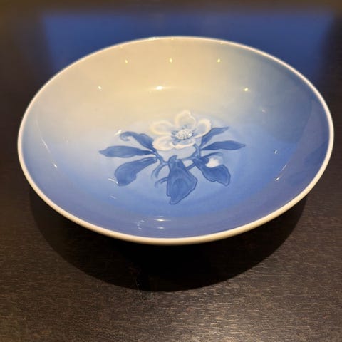 Bing & Grøndahl skål med blå blomstermotiv. Fremstillet i porcelæn med detaljeret blå blomsterdekoration på hvid baggrund.