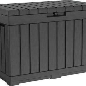 Udendørs opbevaringsboks i sort metal med låg og hjul. 177 cm x 85 cm. Velegnet til opbevaring af diverse genstande på altan eller terrasse. Robust konstruktion til udendørs brug. Nypris 4.959 kr. Kvittering haves.