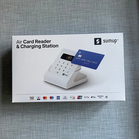 SumUp Air Kortlæser i hvid farve. En kompakt enhed til betaling, der inkluderer en knapbaseret grænseflade og en lille skærm til transaktionsinformation. Udstyret med en integreret printer til kvitteringer. Designet til nem håndtering og brug.