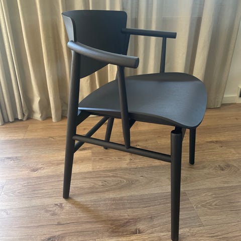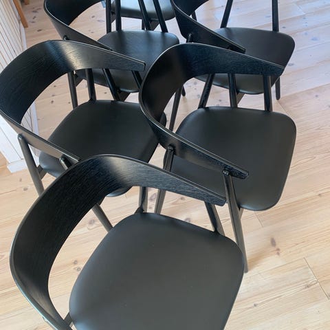 Sort egetræssæde, sort plasticryglæn og sorte stålben. 6 stk. Designer Benjamin Hubert.