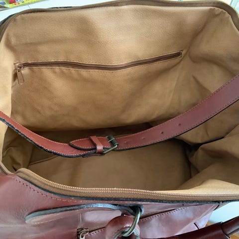 Brun læder taske. Tasken har et klassisk design med håndtag og lynlås.