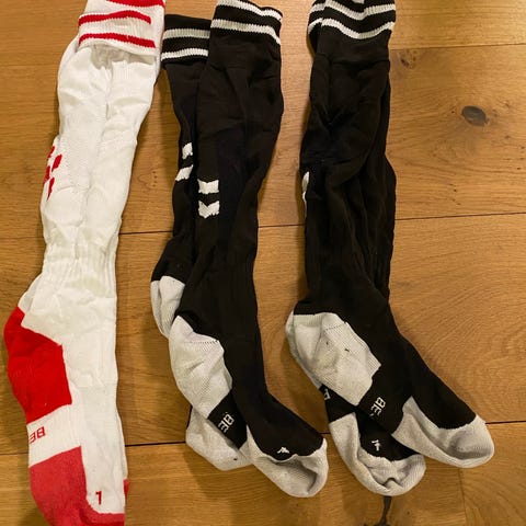 Hummel fodboldstrømper til børn i størrelse 40-45. Sættet indeholder røde og ubrugte sorte gribsoks strømper med skridsikre såler. Designet til brug ved fodbold, lavet i materialer egnet til sport og aktivitet.