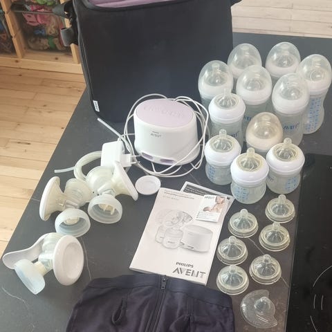 Der medfølger ingen flasker, poser til mælk eller ammeindlæg. Jeg har flasker og tuder i str. 0-3 som kan sælges med efter aftale.