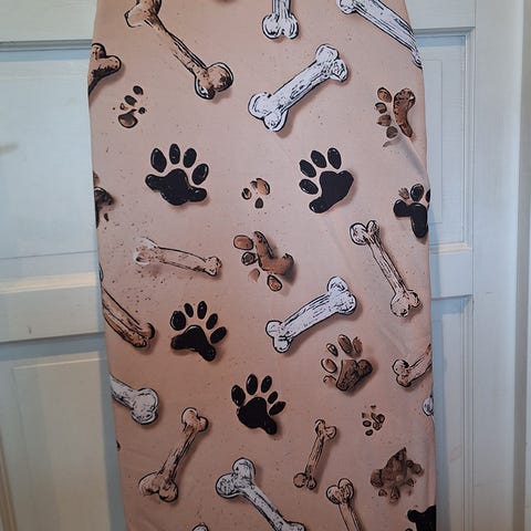 Ubrugt: Strygebrætbetræk med elastisk kant. Betrækket har et mønster med hundepoter og knogler.