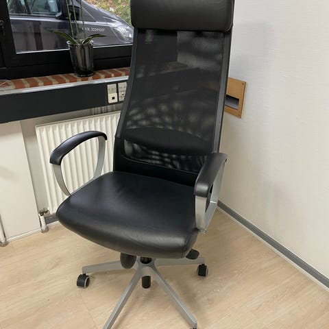Sort kontorstol med polstret sæde og rygstøtte, udstyret med faste armlæn. Stolen har fem ben med hjul, der muliggør bevægelse. Designet til brug ved skrivebord eller kontorarbejde.