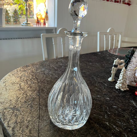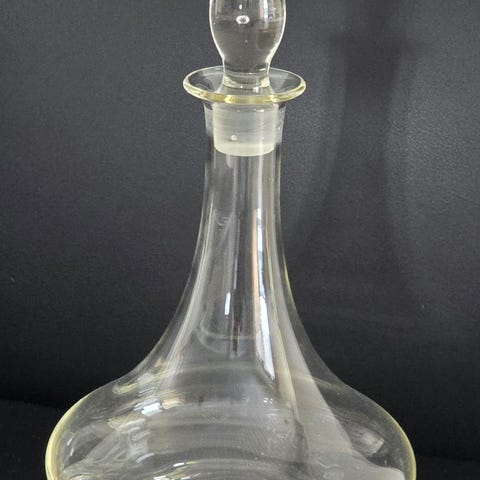 Glas karaffel med hank og prop, gennemsigtig. Højde cirka 30 cm. Egnet til opbevaring og servering af drikkevarer.