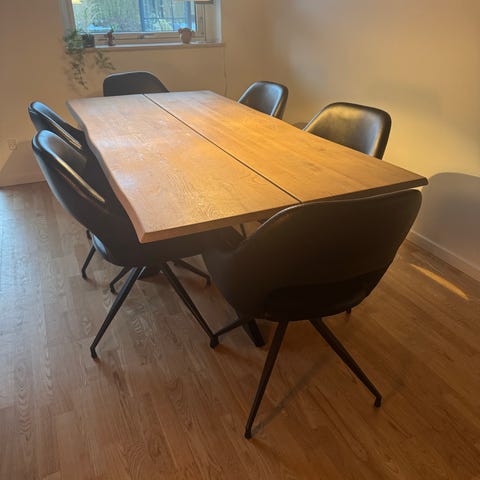 plankebord i oliebehandlet eg med 2 tillægsplader 90x50 samt 6 sorte stole med stofsæde