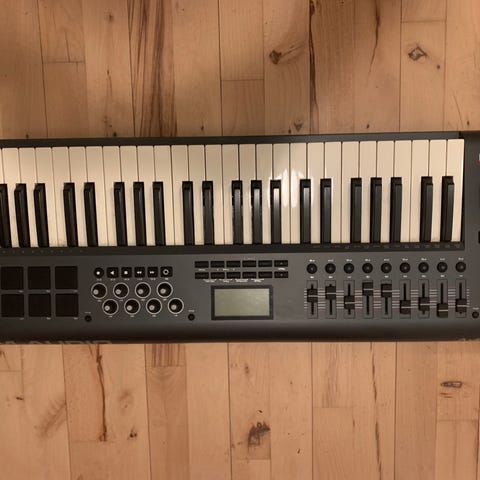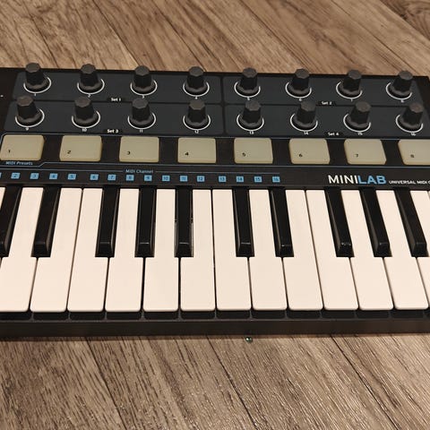 Arturia Minilab MIDI keyboard controller med 25 tangenter, 16 drejeknapper og 8 trykfølsomme pads. Hvid farve. Velegnet til musikproduktion og kontrol af softwareinstrumenter.