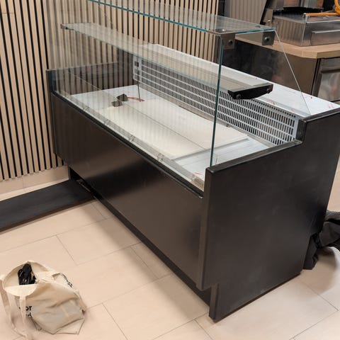 Køledisk med glaslåge og granitbordplade. Anvendelig til opbevaring og præsentation af madvarer i kommercielle køkkener eller detailmiljøer. Designet med rustfrit stål og glas, samt en robust granitbordplade til arbejdsområde.