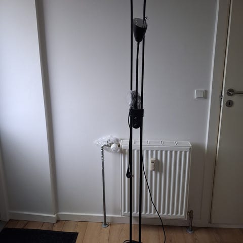 Pip gulvlampe. Hvidelakeret stel af træ med umalede fødder. Hvid skærm. H. 155 cm. Mindre brugsspor.