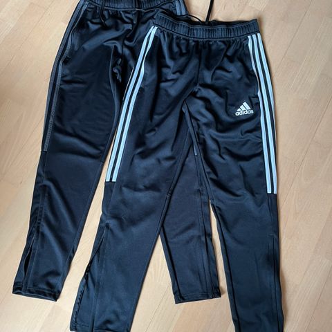 Adidas træningsbukser til kvinder i størrelse M. Bukserne er sorte med hvide striber langs siden. Egnet til forskellige sportsaktiviteter. De er næsten ikke.brugt og er passet godt på. Der er 2 par