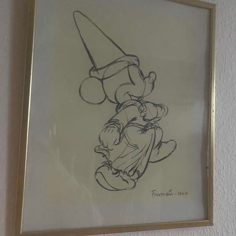 Disney Mickey og Minnie Mouse tegninger i sort-hvid. To separate billeder med skitser af Mickey og Minnie Mouse i sort ramme. Enkel og grafisk stil, velegnet til vægdekoration.