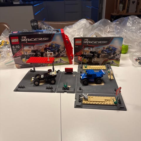 LEGO Racers 8186 sæt med 6 biler. Æsken er åbnet og har set bedre dage, men indhold er nyt og poser uåbnede. Klistermærkerne er desværre forsvundet, så det er uden klistermærker. Lille pose med ekstra klodser følger med, følger egentligt ikke med sættet, men passer fint til.