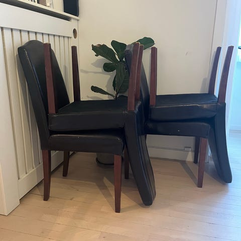 6 stk. spisebordsstole til salg. 3 af dem har patina i læderet i toppen af ryglænet.