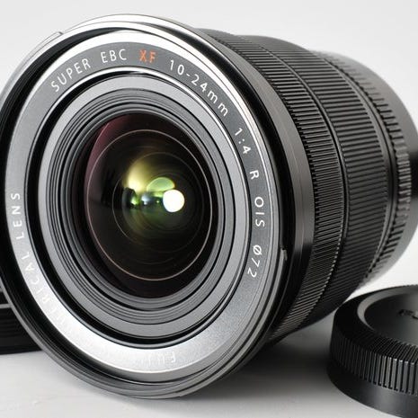 Fujifilm XF 10-24mm f/4 R OIS zoomobjektiv med super EBC coating og asfærisk linse. Objektivet har en brændvidde på 10-24mm, blænde f/4, optisk billedstabilisering (OIS) og filterstørrelse på 72 mm.