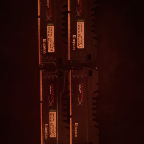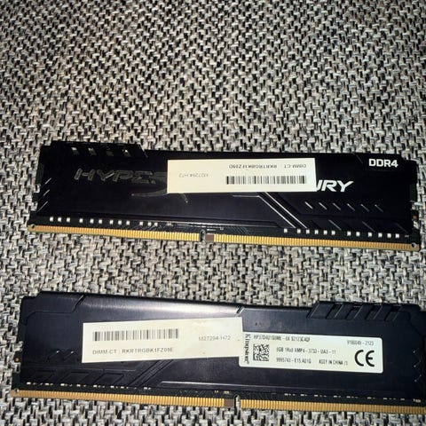 Kingston HyperX Fury RAM bestående af 2 moduler på hver 8GB, i alt 16GB hukommelse. DDR3 type med 1600 MHz frequency. Sort farve. For ny koster de over 500kr pr. stk.
