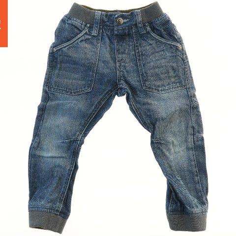 Disse er et par blå jeans til børn. De har en elastisk talje og lommer både foran og bagpå, hvilket giver ekstra funktionalitet. Stoffet er denim, som er almindeligt for jeans og giver en robust kvalitet.
