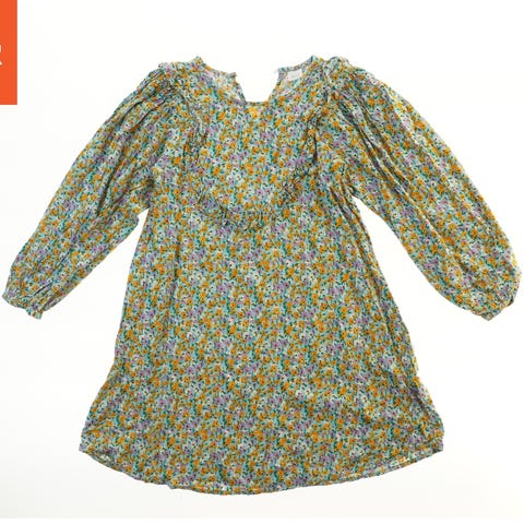 Kjole med blomsterprint i røde og gule nuancer på en blå baggrund. Kjolen har korte ærmer og et skørt, der bærer blomsterdesign hele vejen rundt. Egnet til børn.