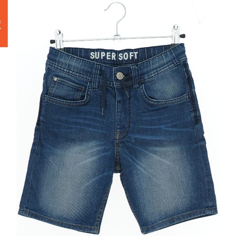 Disse børneshorts er lavet af denimmateriale og har en klassisk blå farve. De har lommer foran og bagpå, samt en knaplukning i taljen. Der er bæltestropper til fastgørelse af et bælte.