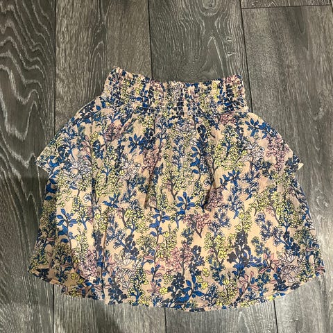 Nederdelen har en blomstret mønster i nuancer af blå og gul på en lys baggrund. Den har en elastisk talje og er designet med en let rynket struktur. Stoffet er transparent med underskørt for ekstra dækning.