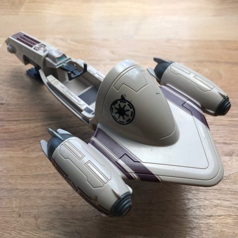Dette er et vintage rumskib legetøj lavet af plastik. Det har en kompakt størrelse på 12x9x7 cm og viser futuristiske designfunktioner, herunder paneler med dekorative klistermærker. Rumskibet har en lys cremefarve og flere enheder og former, hvilket giver det et autentisk rumfartsudseende.