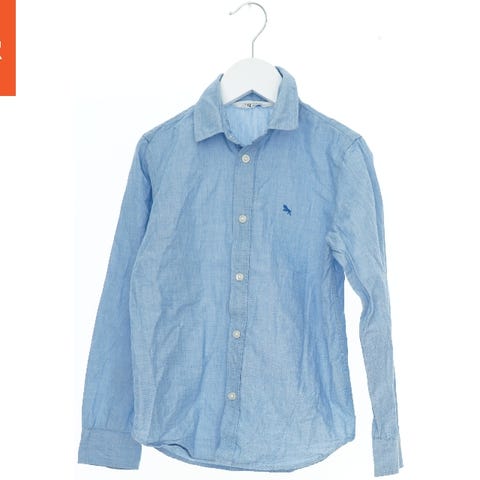 En blå langærmet skjorte med et småt hvidt mønster. Skjorten har knapper på fronten og en brystlomme.