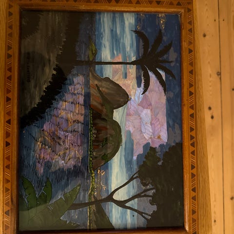 Serveringsbakke i træ med indlagt dekorativt Brasilien motiv. Bakken har en glasoverflade med et kunstnerisk skildring af palmer og landskab, indrammet af træ med klassisk design. Den har to håndtag integreret i siderne for nem transport. Bakken er 49 cm lang og 27,7 cm bred.