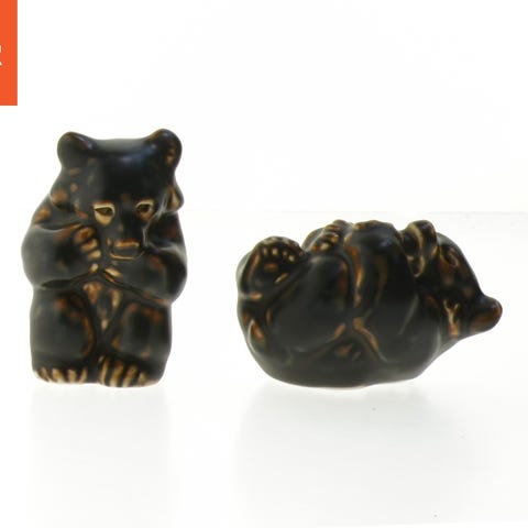 Sættet indeholder to små sortfarvede keramiske figurer, som forestiller dyr. Begge figurer har en blank finish med små brune nuancer. Undertiden er der stempler som angiver 'DENMARK'. Den ene figur viser et lille dyr med en position, der holder poterne over hovedet, mens den anden ligner en sammenkrøbet kanin. Højderne på figurerne er henholdsvis 7 cm og 6 cm. Tags: keramisk, dyr, figurer, dekoration, Royal Copenhagen, dansk.