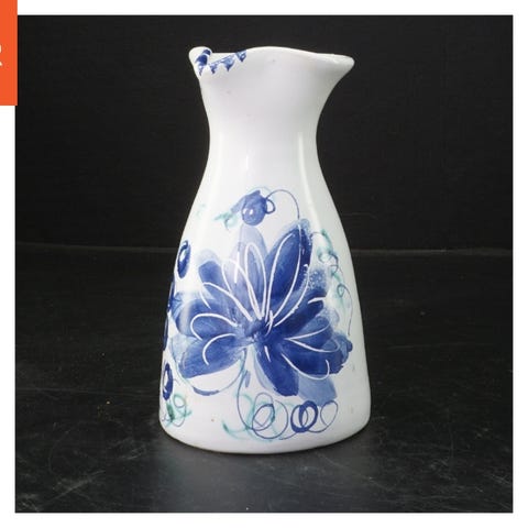 Denne keramiske kande har en højde på 14,5 cm og er lavet i en lys gul farve. Den har et dekorativt motiv af blade på håndtaget og ved åbningen. Forsiden bærer teksten 'Parfumerie Diduis Grasse France', hvilket giver den et fransk inspireret tema. Kanden har en enkelt hank og er beregnet til at hælde væsker. Bunden af kanden kan have nogle mindre brugsspor.
