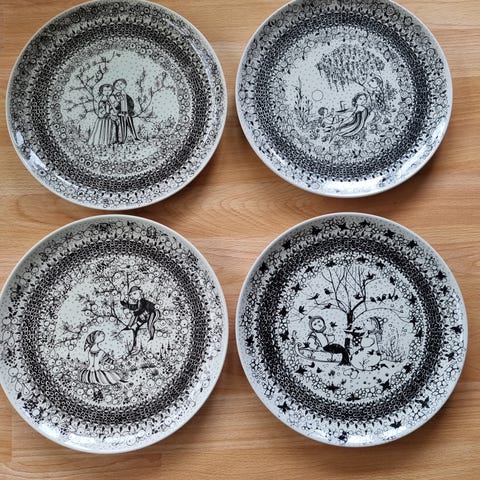 Bjørn Wiinblad tallerkner med Årstiderne (Aarstiderne) som motiv: vinter, forår, sommer, efterår. I rigtig god stand.
