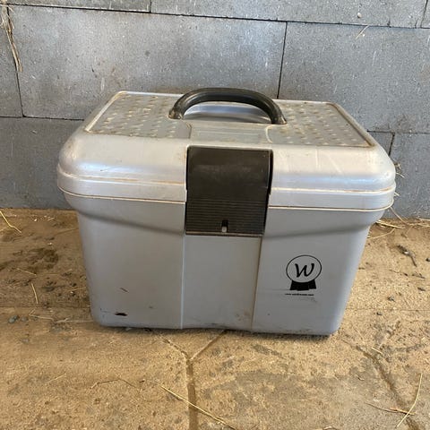 Kassen er rummelig og meget robust, med stærke metalbeslag, hjørneforstærkninger og kraftigt håndtag – perfekt til stald, stævner eller opbevaring derhjemme.