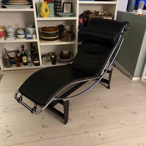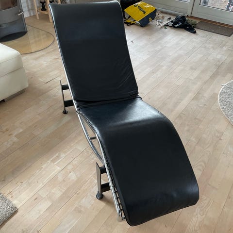 Særdeles god liggestol i sort læder med nedfældelig ryg.